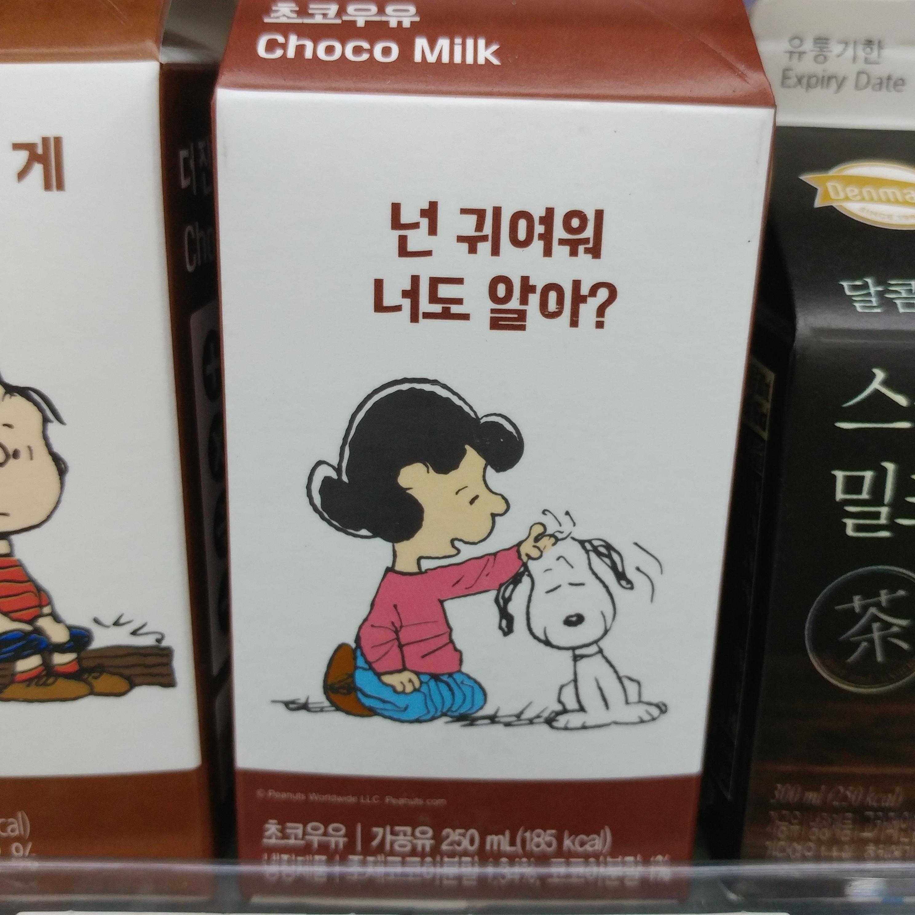초코우유 Choco Milk를 장식한 스누피의 루시 반 펠트: "넌 귀여워. 너도 알아?"